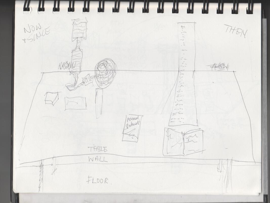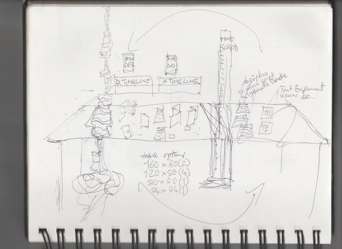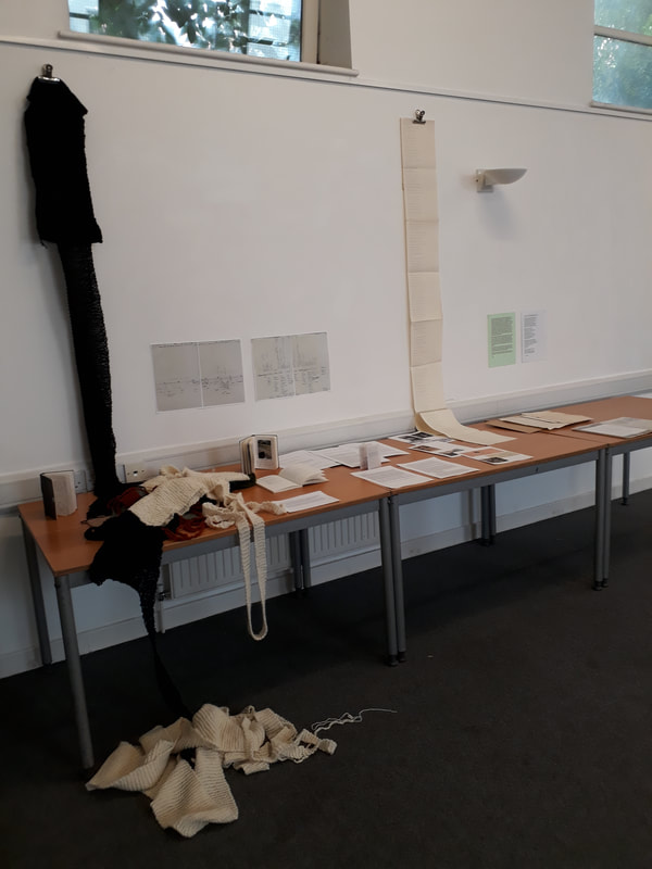 As Nick and Di grapple with this new reality and Di begins the long climb towards recovery, exhibition plans adjust to accommodate the situation. The Knitting, timelines and the tracing paper books are packed up along with sketches for the tables layouts of the materials which Di envisages are packed up in a box which somehow (via the post or Cathy?) makes its way from France to London: