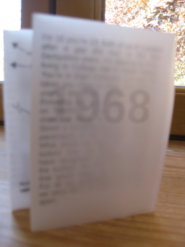 I've just completed a tiny 'artist book' - zig-zag format in tracing paper - it contains a very small amount of info re our lives in 1968 but if I manage to make some more they could be the beginning of an ongoing collection that could be a small display within any future MM exhibitions - starting with this one. I really like the idea of building up a collection of 'Year Books' in this way - and maybe the next one could be 1970 and then 1961...